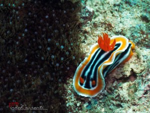 Nudi is a nick name for the Nudibranch. You may think it is related to naked, yes, it is! Nudibranch means “naked gill”. It is an invertebrate animal from the molluscs group that can be found anywhere in the oceans. They are more diverse in tropical seawater like in Thailand, the Philippines, Malaysia and Indonesia. There are more than 100 groups of Nudibranch; and Chromodoris is one of the more popular ones because it has a large number of species. Chromodoris is also called Goniobranchus.