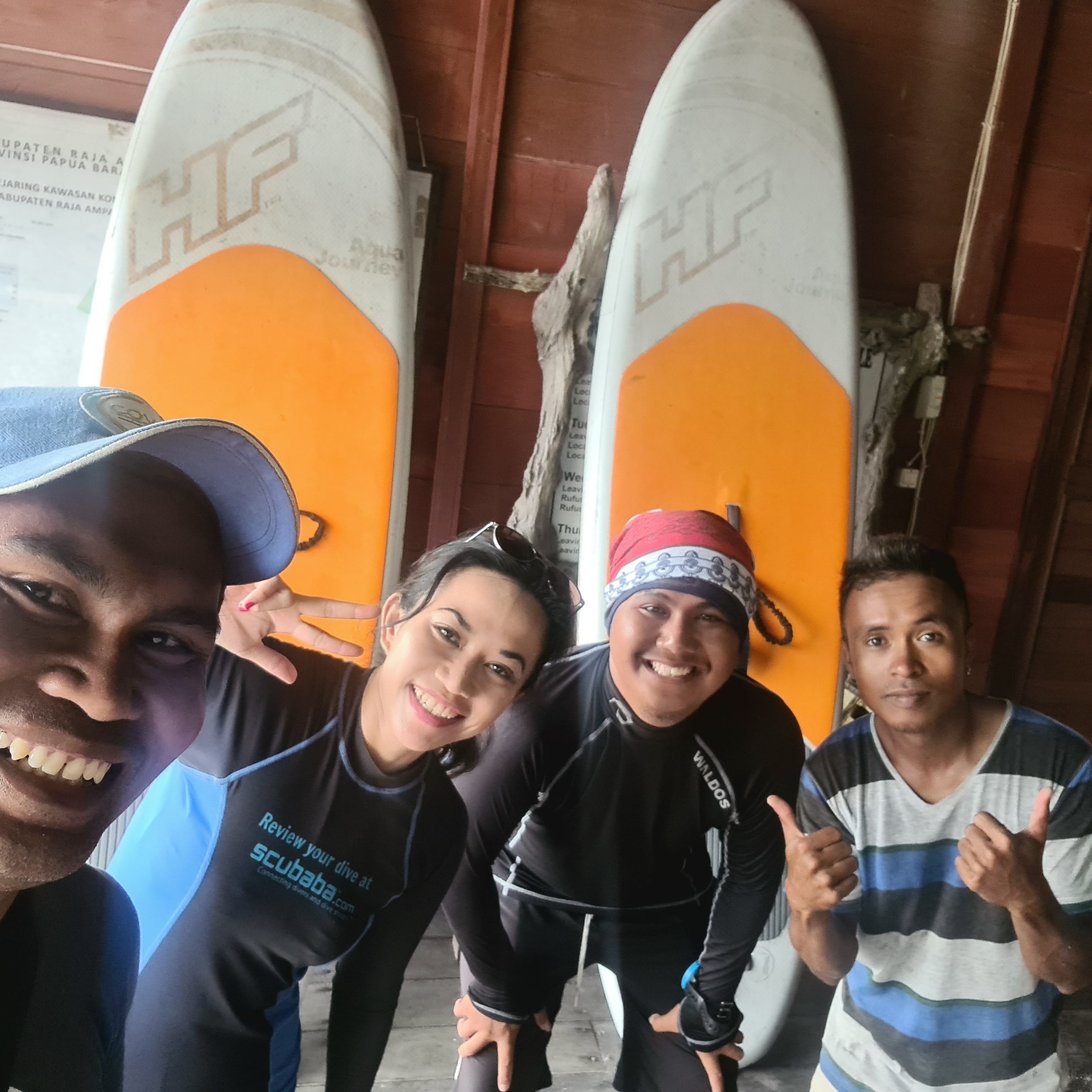 To reach the Piaynemo viewpoint, we sailed with our diving team from Yeben Island through a maze of small islands, crystal-clear waters, and vibrant coral reefs. The journey is a feast for the eyes and offers glimpses of the region’s natural wonders. Upon arrival at Piaynemo, we climbed a series of wooden stairs that lead to the viewpoint. The ascent can be challenging, but the rewarding panoramic view at the top is well worth the effort. From this viewpoint, we were treated to a breathtaking vista of the mushroom-shaped karst islets that dot the turquoise sea, creating a picturesque and almost otherworldly scene.