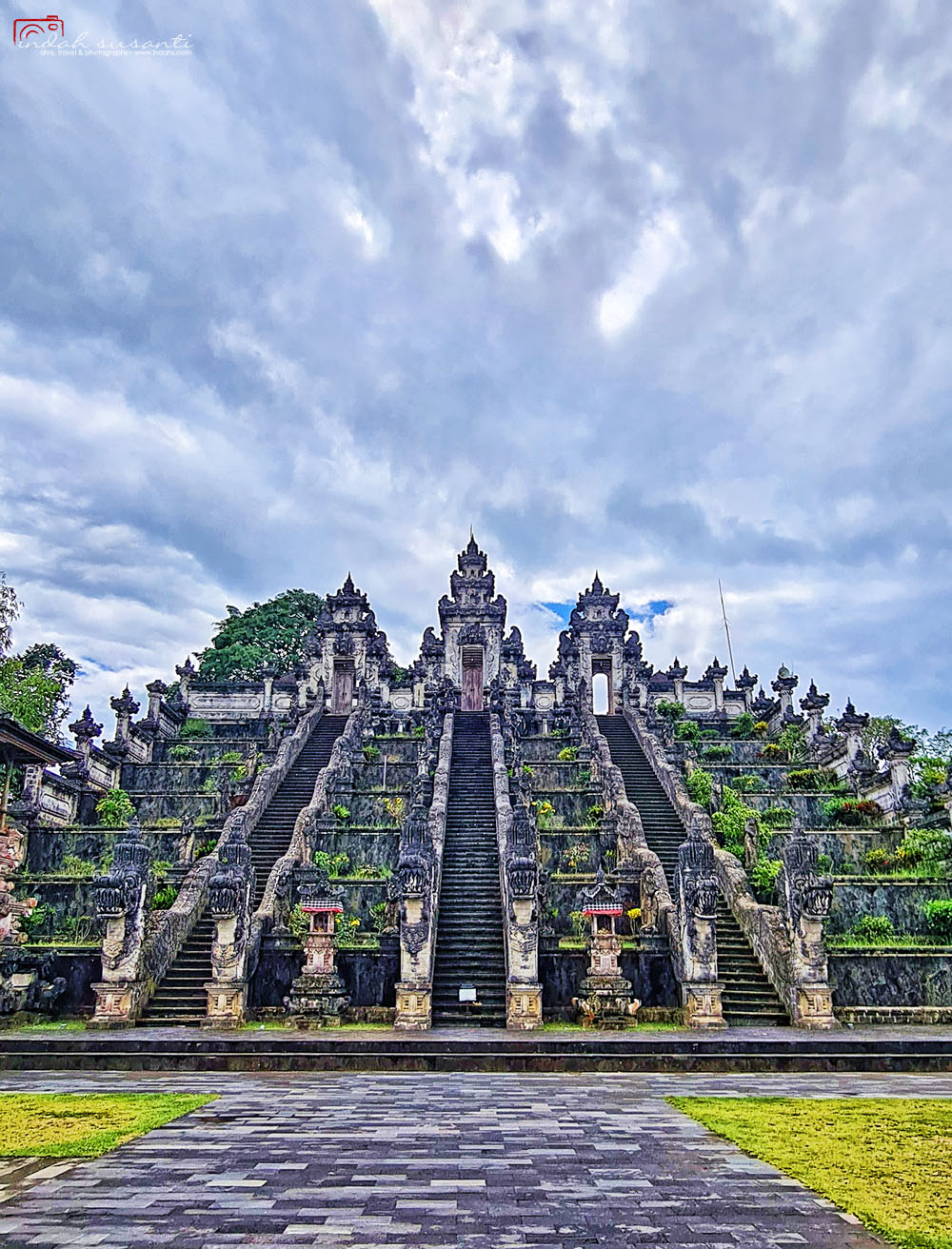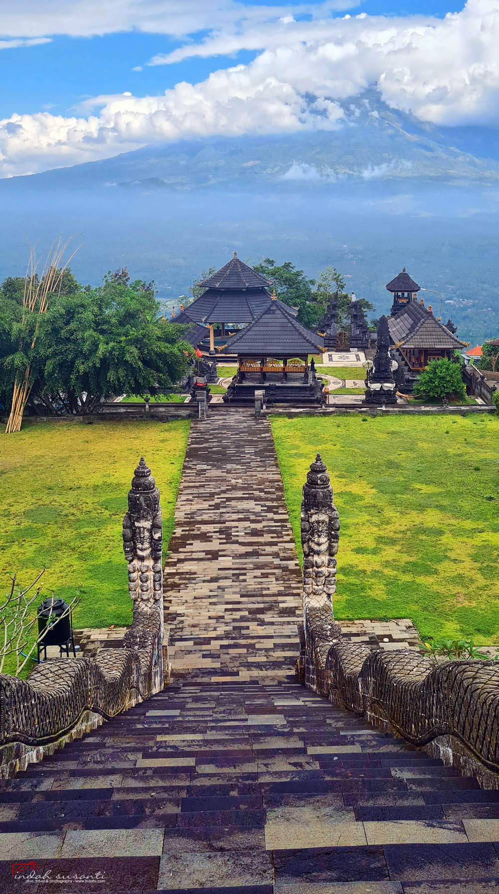 The sacred Staircase and gateway in the Temple are stunningly beautiful. As you ascend the stairs, you’ll pass through various gateways or “candi” representing different levels of spiritual purification. Each gateway signifies a transition from the material world to the spiritual realm. The number of stairs can vary depending on the starting point, and the climb can be challenging. But the view from the top is enriching. The stunning view through the gate is believed to be a glimpse of the divine and represents the threshold to a sacred space.